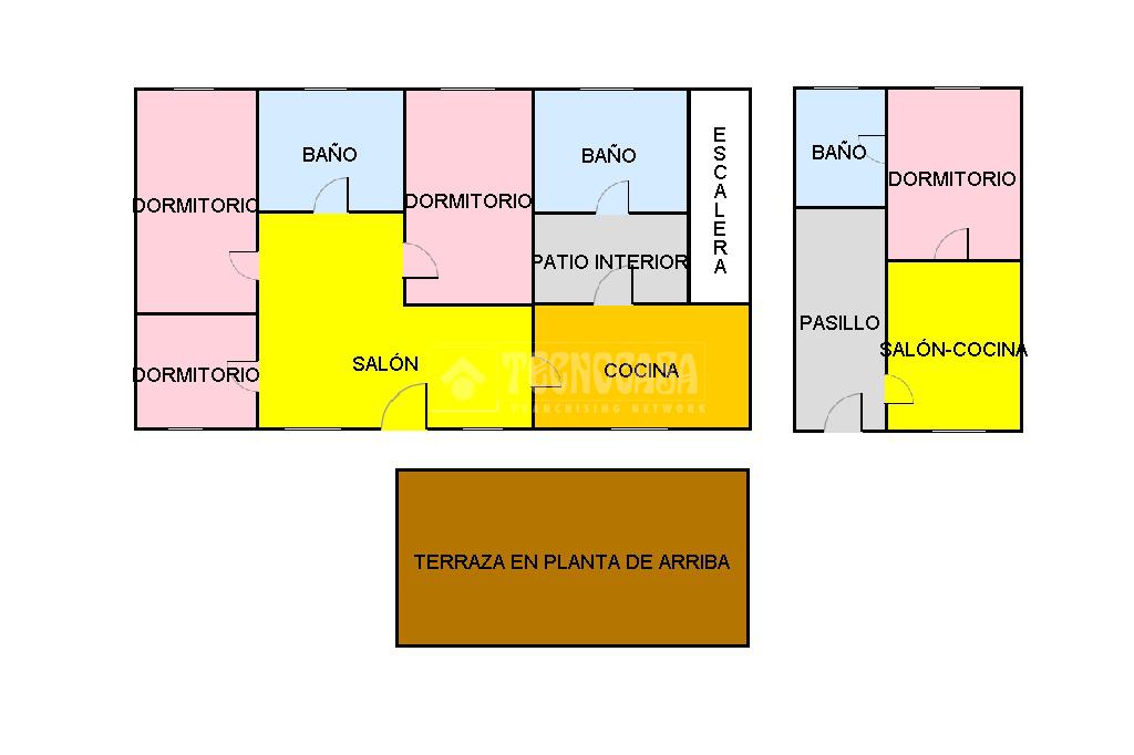 La casa principal se distribuye en un luminoso salón, cocina, baño con plato de ducha y tres dormitorios de buen tamaño. Además, cuenta con una práctica escalera que da acceso a una amplia terraza.